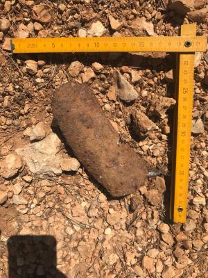 Pere Rullàn documentant l’espoleta d’un morter.Avui 3 d’agost el dia es torna a presentar calorós ja des de les 6.30 del matí, tots i cada un dels participants de la campanya ens anem reunint al menjador de Ca Ses Monges. Alguns amb els llençols encara aferrats, comenten com han passat la nit mentre es preparen el cafè o omplen les cantimplores d’aigua, en acabar emprenem el camí cap als cotxes que ens portaran cap als escenaris on transcorregueren les úniques batalles lliurades a Mallorca durant la guerra civil.