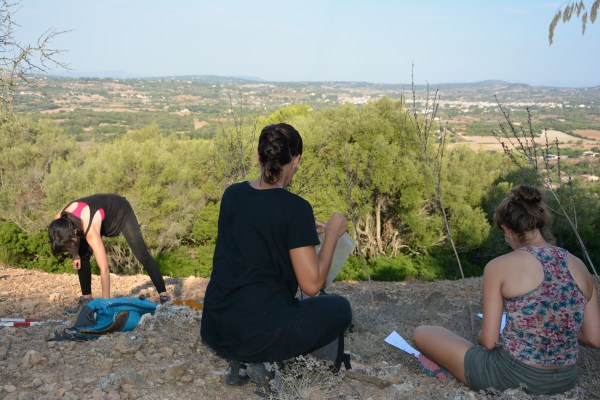 Alejandra, Marina i Maria Antònia en el parapeto de Son Puça el 2018, amb Sant Llorenç al fons.